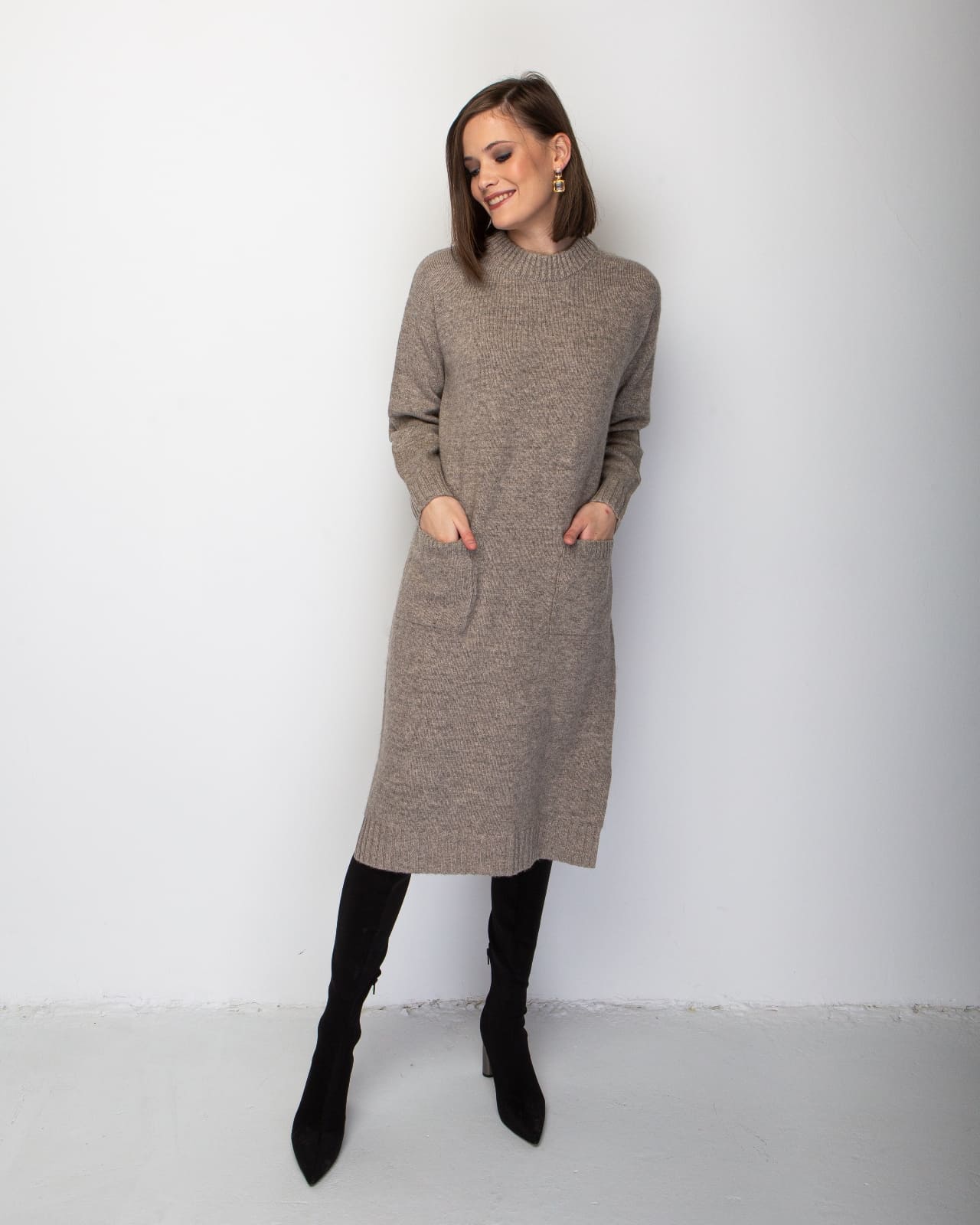13088. Но они разные. Платье 13088 тоньше и немного светлее. За счёт тонкого полотна смотрится элегантнее. Это платье с карманами более утилитарно. Толстое, напоминает свитер. Сидит хорошо. Для зимы.