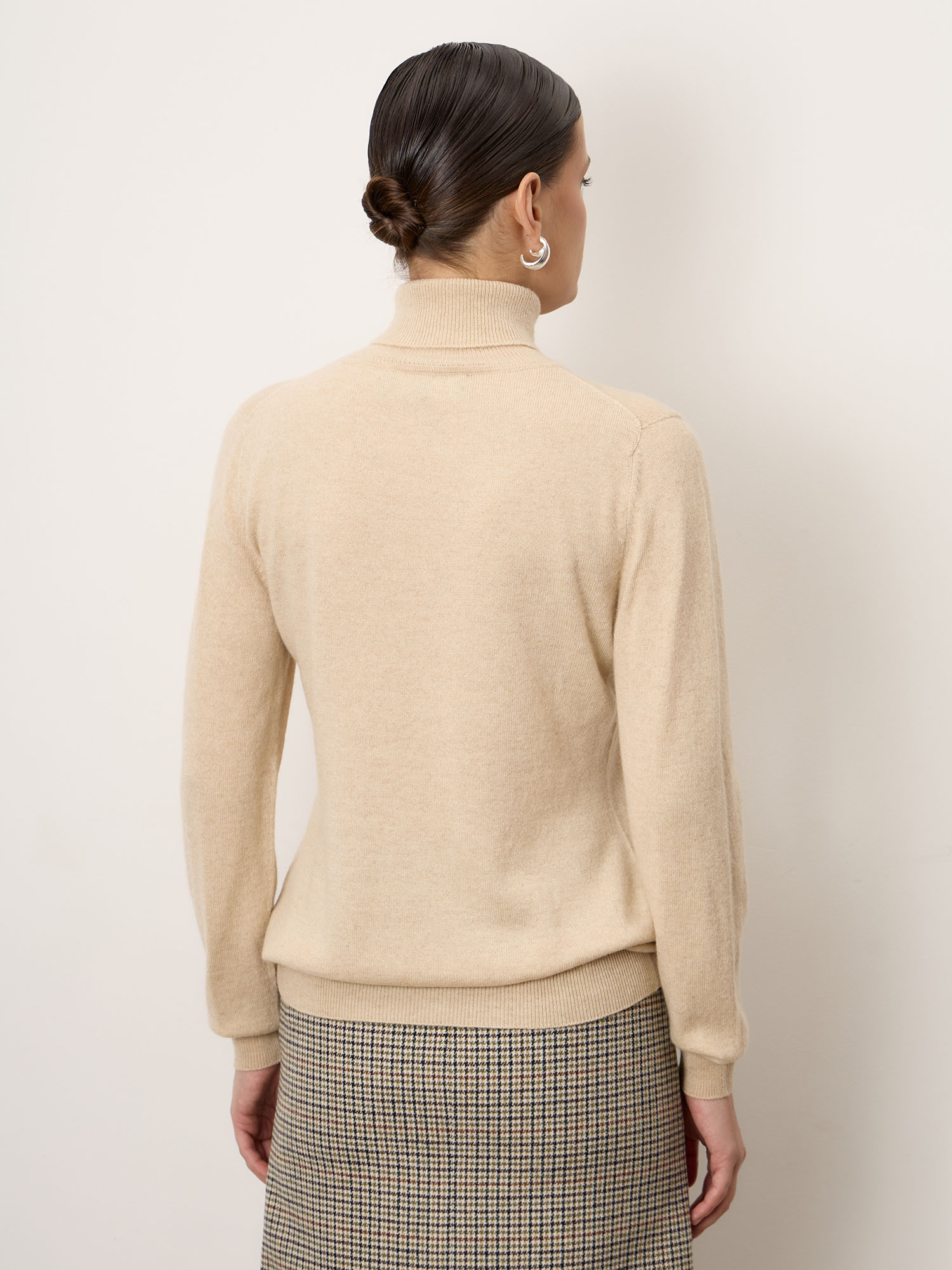 Бежевая водолазка из чистого кашемира — это базовая вещь класса люкс. Она долговечна, универсальна и легко вписывается в любой капсульный гардероб, подчёркивая вкус и статус своей обладательницы.